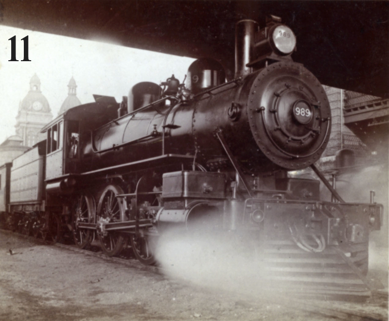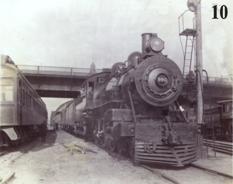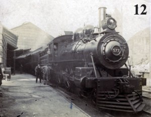 Image #11 shows GTR 4-6-0 No 989, also with an eastbound passenger train that is somewhat shorter than in the previous view since the engine is positioned directly underneath the York Street bridge. The structure behind the locomotive on the right contained an elevator used to transport baggage and express from York Street down to track level. Nos. 989 and 990 were both built by the Grand Trunk in 1899. In 1923, they were acquired by Canadian National and renumbered 1558 and 1559. Both were scrapped in the 1930’s.