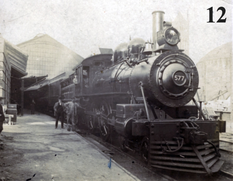 Image #12 depicts yet another eastbound passenger train at Union Station, this time in the north train shed. Barely visible on the right are the Union Station office tower and the Cyclorama that survived into the 1970’s as a parking garage. On the left is the Canadian/American Express building, which by this time had been acquired by GTR. Locomotive No. 577 is a 4-4-0 American.