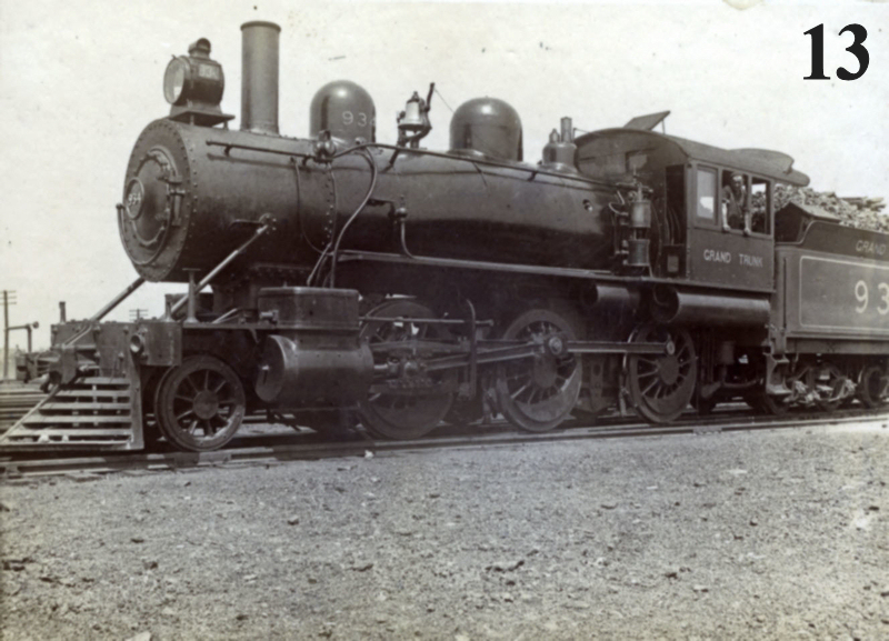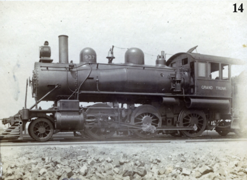 Images #13 & 14 are Grand Trunk 2-6-0 Moguls Nos. 934 and 937. There is no information as to location. These locomotives were usually assigned to light freight service but could appear in any duty when the need arose. Both were built by GTR in 1900, became Canadian National engines, and were scrapped in the 1930’s.