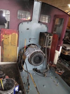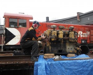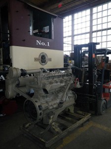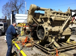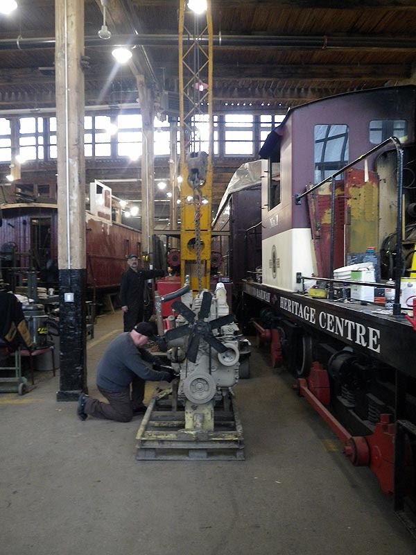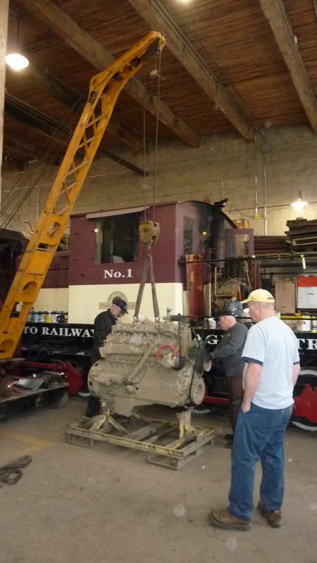 As you may recall from TRHA news posts last summer, one of the two diesel engines in our CLC Whitcomb locomotive failed last summer. This winter we removed the failed engine and order a new reconditioned engine as its replacement. In these photos, we find our new engine being delivered to the Roundhouse. We also see parts being removed from our old engine to be cleaned up and used to install the new engine. The engine area of the Whitcomb has also been cleaned up and painted in preparation for the installation. Finally, below, we see Elwood the Crane being set up for a test lift of the engine to ensure that all is ready for the final installation.