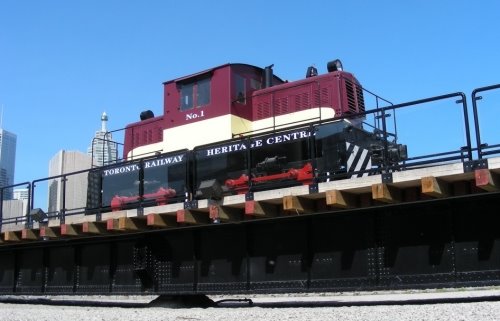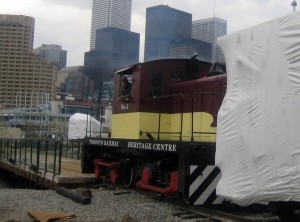 As the Victoria Day weekend approached we were busy preparing for a bus tour from the convention to the Roundhouse and Union Station. In the picture at the above left, we see our CLC 50 ton Whitcomb handsomely dsplayed on the turntable bridge with its new handrail system in place. In the middle picture, the Whitcomb is being used to move equipment around for better viewing of the roundhouse. At the right, finishing touches are being applied to the restoration of one of our lorries while another stands unrestored in the foreground.
