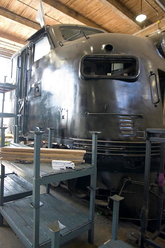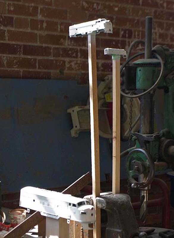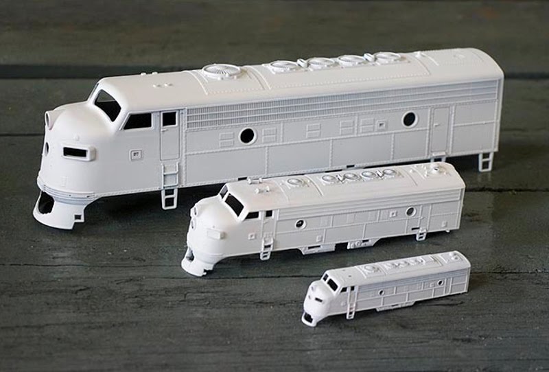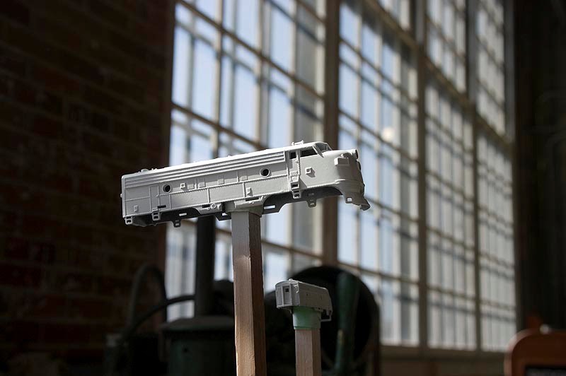 One of our projects for our temporary museum is the development of a display which will show the relative size of a model of a F7 Diesel locomotive in each of the popular model railroading scales. This weekend, we disassembled and prepared the bodies of N, HO and an G Scale units for painting. here we seem them painted with a base coat of flat white paint after having had most of their needed minor repairs and body filling done. Our next tasks to work up some replacement handrails and details and then paint them for display. We do of course also have a 1:1 scale F7 cab as well to compare the models to as shown in the photos.