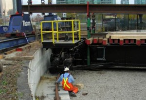 Today we feature some of the team from Western Mechanical who made it happen this week. At the upper left, we see four of Western Mechanicals finest … from left ot right, technicians Joe and Matt, lift boss Nick and project engineer Rob. In the centre photo above, Nick checks underneath as the turntable touches down on the rails. In the photo at the right above, the sheer size of the job becomes apparent in this shot as Rob checks the centre bearing. At 120 feet long and 340,000 lbs in weight, we believe this will be the largest working compressed-air-motor driven turntable in existence today.