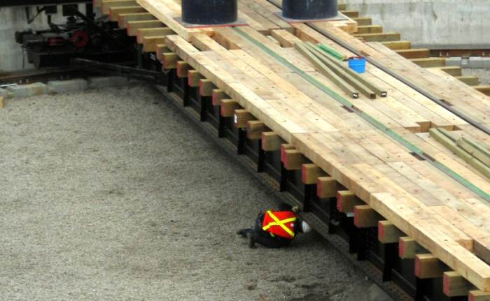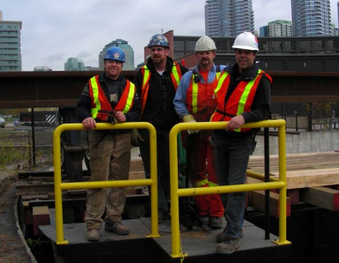 Today we feature some of the team from Western Mechanical who made it happen this week. At the upper left, we see four of Western Mechanicals finest … from left ot right, technicians Joe and Matt, lift boss Nick and project engineer Rob. In the centre photo above, Nick checks underneath as the turntable touches down on the rails. In the photo at the right above, the sheer size of the job becomes apparent in this shot as Rob checks the centre bearing. At 120 feet long and 340,000 lbs in weight, we believe this will be the largest working compressed-air-motor driven turntable in existence today.