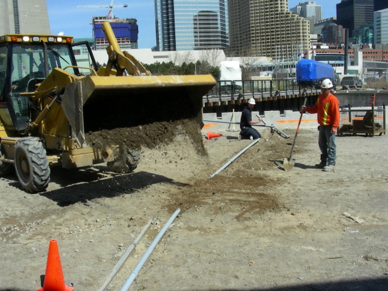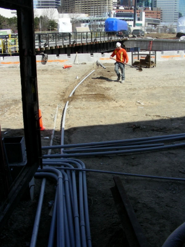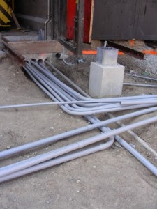 As can be seen in the above pictures, an electrician’s nightmare of conduit now runs below the “patio” surface to stall 17 to connect lighting fixtures to controls in the museum. The two pipes seen being buried in the pictures above are (on the left side) the compressed air feed to the museum and the conduit feeding the locomotive display floodlights located on the turntable.
