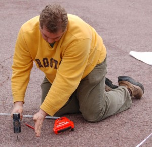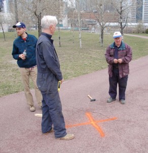 As shown in the pictures above, James headed up a crew of Dave, Wilson, Jim, and Jason P. working on a preliminary survey and marking of the miniature track alignment on the east side of the park. The place is currently dotted with orange markers for both the key measurement points and the crossover location.