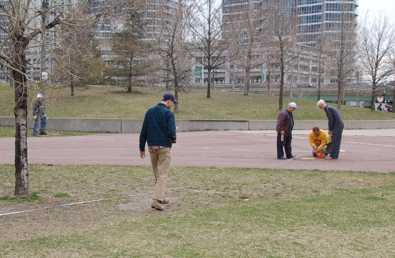 As shown in the pictures above, James headed up a crew of Dave, Wilson, Jim, and Jason P. working on a preliminary survey and marking of the miniature track alignment on the east side of the park. The place is currently dotted with orange markers for both the key measurement points and the crossover location.