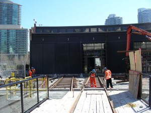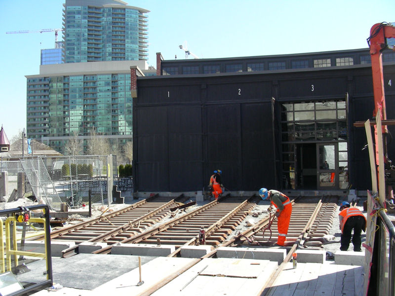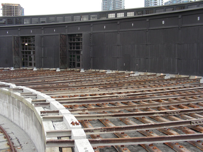Below you will find pictures documenting the rapid progress that PNR is making to lay down the radial tracks leading from the turntable to the roundhouse doors.