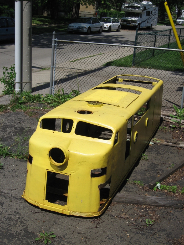 While not as common today, in the past, there were many commercially operated miniature railways which took kids of all ages for rides. In the upper left photograph, you are viewing the body shell of one such locomotive which ran on 15″ gauge tracks at one time. A similar locomotive ran in the toy department of the downtown Toronto Eaton’s store in the 1950’s. I know because I rode it as a child!