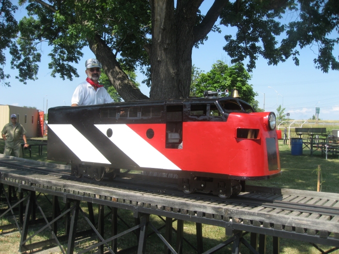 Recently, Michael Guy, a director of the TRHA, acquired this shell. He decided to build a 7 1/4″ gauge powered chassis so that we could duplicate the experience of the 1950’s on the more common 7 1/4″ gauge tracks used by miniature railway enthusaists such as Michael and myself. In the other two pictures, the engine is pictured in its inaugral run at the Golden Horseshoe Live Steamers (GHLS). After a few adjustments the engine ran perfectly. It ran so well that we used it to pull passengers on the riding cars used by this club for that purpose.
