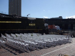 In the appealing (to a railfan at least!) picture at the upper left, #4803 is bracketed by our CLC Whticomb and #7069. In the middle picture, Steam Whistle Brewery has used the space in front of their meeting space to set up for a wedding with #4803 looming above them. The wedding occured last Saturday. It is intriguing that couples are finding Roundhouse Park an attractive venue for their nuptials!