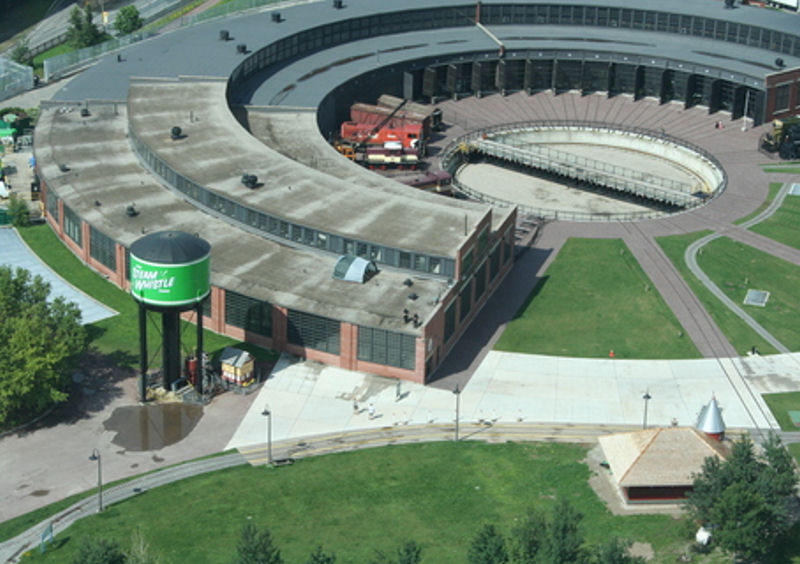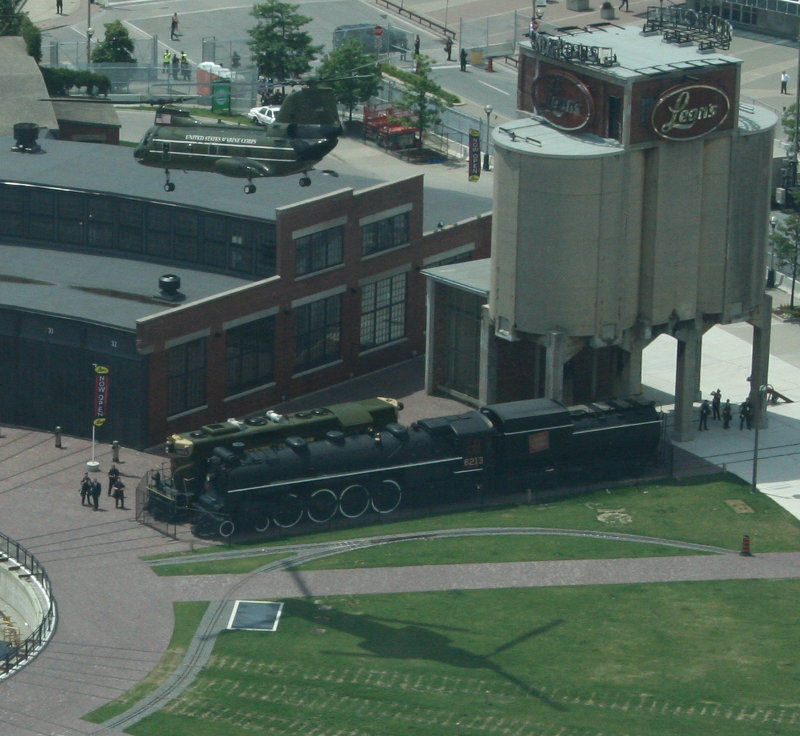 Continuing our coverage of the helicopter activity at Roundhouse Park just before the G20 Summit, these photos by Ryan De Laplante from his nearby condominium show test flights being made just prior to the event. The Marine helicopter with a white top is “Marine 1”, President Obama’s official helicopter. The helicopter-less picture at the upper left shows our equipment tucked in close to the roundhouse and out of the way of the action.