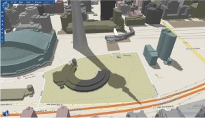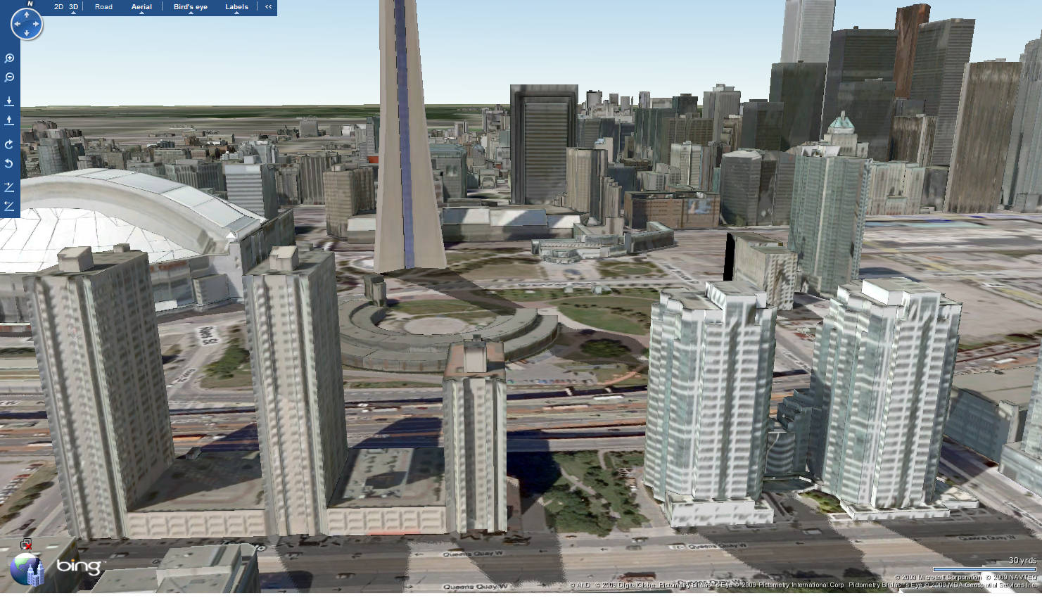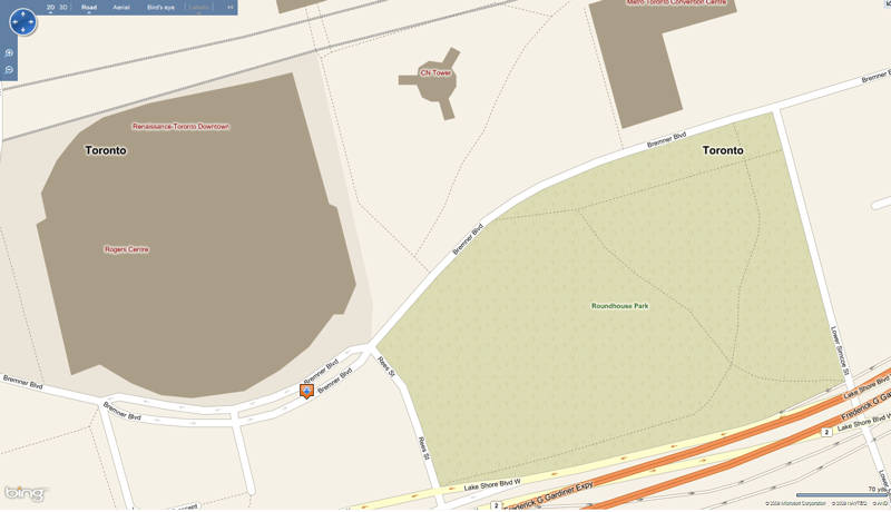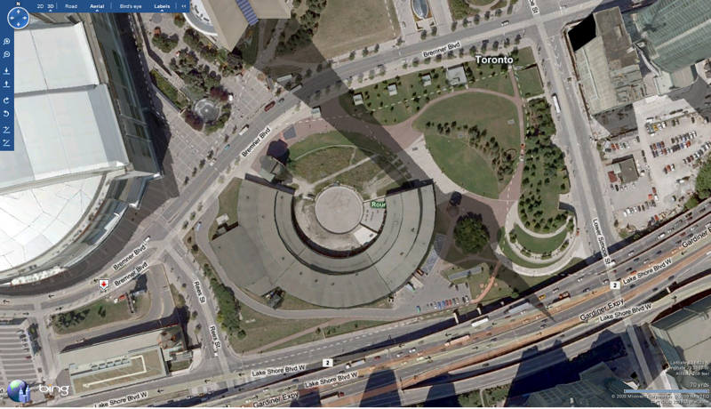 Continuing on our theme of “Roundhouse Park from Above”, we now turn to Microsoft’s Bing Maps service (formerly Windows Live Maps). To see these images online and others at Bing Maps, click here or enter the address of Roundhouse Park – “255 Bremner Blvd, Toronto, ON” at Bing Maps.