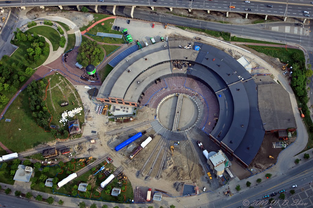 An exception is this strikingly clear image that was shot by Wayne D. Shaw on June 22, 2009 during a birthday celebration at the Tower’s 360 restaurant. Wayne has kindly given us permission to share this photograph on the TRHA website. One can see that blue fencing almost completely surrounds Roundhouse Park, the installation of the patio stones around the turntable is not complete and the landscaping has not yet begun. Wayne plans on returning to the top of the tower to take another photograph after the Toronto Railway Heritage Centre opens. We wish him luck in capturing an equally striking image and we look forward to sharing it with you.