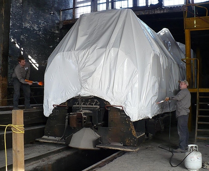 The TRHA need to move some of our collection of engines and rolling stock to new tracks being installed by PNR Rail Services in Roundhouse Park using the turntable. This will allow restoration of the interior of the roundhouse to proceed without impediment. Last week, contractors began the process of shrink wrapping this equipment as you can see in the pictures above. Thanks to David Wetherald for allowing us to use his pictures to share this story with you.
