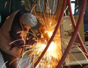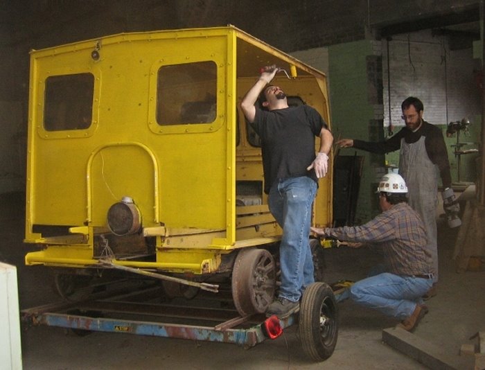 Yesterday’s work bash went swimmingly and not only due to the rain! Thanks to Lance, Richard M., James R., Ron, Jason P., Michael and Dan, the speeder got a rub down and first coat of paint, we have two new fluorescent light fixtures working and the velocipede gang made a start on identifying the remains of a velocipede in our possession.
