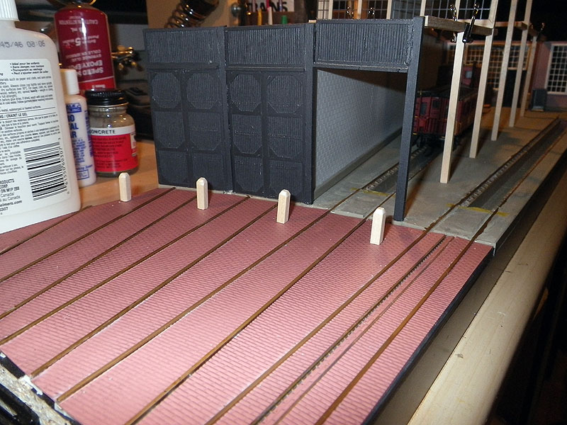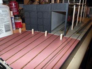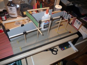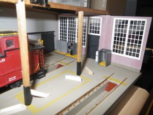 Continuing on from our previous posting on the model of Stalls 15 and 16 in HO Scale, once the drywall compound “concrete” floor had set, it was painted to look more like concrete, and the walls could start being installed. Image 10 shows the cinder block wall of Stall 15 along with the doors of Stalls 13 and 14 installed, with the timber structure being worked on, and the rear walls being test fit while still not complete. Image 11 shows even the small details being worked on, the exterior door posts on the patio which hold the large doors open.