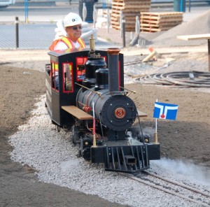 As mentioned earlier, the Sweet Creek miniature locomotive had made its first trial runs on the Golden Horseshoe Live Steamers track in Hamilton. Once, we had sufficient track installed at Roundhouse Park, it was time to further test our locomotive on our new track at Roundhouse Park. In the picture at the above left, we see the locomotive starting up with the cylinder cocks open accounting for the steam shooting out from the front of the locomotive. When the cylinders are not yet up to temperature you can easily have water instead of steam in the cylinders which can damage them. With the cyliners cocks open, steam is used to force any such water out. In the middle picture, we see the locomotive’s whistle being blown. In the final picture, we have a great shot of the Sweet Creek passign in fron of #6213 on the turntable.