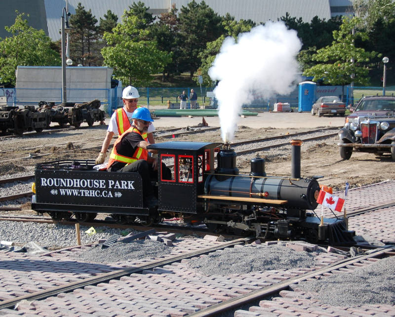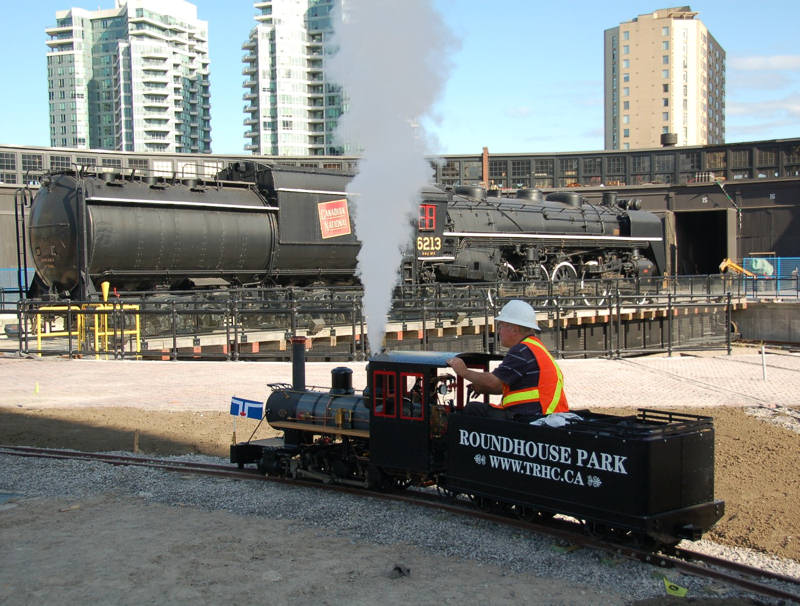 As mentioned earlier, the Sweet Creek miniature locomotive had made its first trial runs on the Golden Horseshoe Live Steamers track in Hamilton. Once, we had sufficient track installed at Roundhouse Park, it was time to further test our locomotive on our new track at Roundhouse Park. In the picture at the above left, we see the locomotive starting up with the cylinder cocks open accounting for the steam shooting out from the front of the locomotive. When the cylinders are not yet up to temperature you can easily have water instead of steam in the cylinders which can damage them. With the cyliners cocks open, steam is used to force any such water out. In the middle picture, we see the locomotive’s whistle being blown. In the final picture, we have a great shot of the Sweet Creek passign in fron of #6213 on the turntable.