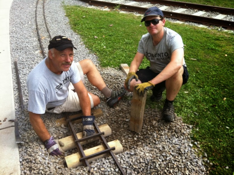 After many years of heavy service and a successful summer season where our rider traffic doubled from the previous year, we are now taking advantage of cool fall weather to aggressively address ongoing maintenance of our track system. In the photo above, we find Carlton and Dave working with Michael Guy to replace wooden ties that have stood up well over time but are near the end of their working lives. Most of our rail is embedded in concrete but there are still many wooden ties as well to be checked and replaced.