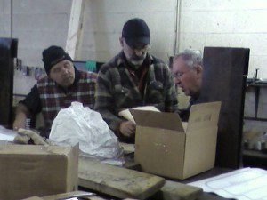 Over the Christmas holidays, a 2,500 pound shipping crate containing the kit of locomotive parts was delivered to a workshop where assembly of our steam engine is taking place. In the picture at the left, Arno and Michael inspect the contents of the crate as they prepare to check that everything is present and undamaged. In the middle picture, we can see the completed boiler for the engine. This was built by a professionally accredited boiler maker to comply with TSSA regulations for a pressure vessel of this size. The heating surface is twenty square feet with a steam working pressure of 120 pounds per square inch and is not superheated. Fuel oil will be used initially with a change to coal firing possible at a later date. In the right hand picture, we find Bob, Michael and Dave sorting through the many parts involved in such a complex engine.