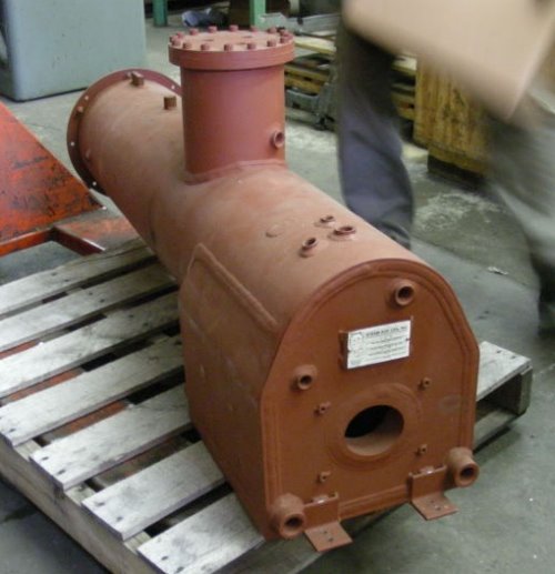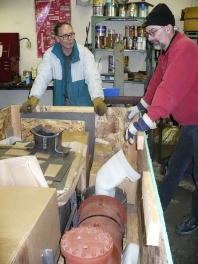 Over the Christmas holidays, a 2,500 pound shipping crate containing the kit of locomotive parts was delivered to a workshop where assembly of our steam engine is taking place. In the picture at the left, Arno and Michael inspect the contents of the crate as they prepare to check that everything is present and undamaged. In the middle picture, we can see the completed boiler for the engine. This was built by a professionally accredited boiler maker to comply with TSSA regulations for a pressure vessel of this size. The heating surface is twenty square feet with a steam working pressure of 120 pounds per square inch and is not superheated. Fuel oil will be used initially with a change to coal firing possible at a later date. In the right hand picture, we find Bob, Michael and Dave sorting through the many parts involved in such a complex engine.