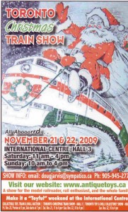 “All Abooarrd….. We are pleased to announce that we have been able to secure space at the International Centre for November 21 & 22, 2009. This will enable us to produce Canada’s largest train show. You will be amazed at the over 50 displays and operating layouts in every gauge of trains. There is about 70,000 square feet of layouts, exhibits, clinics showing how to build layouts and scenery, toy trains, steam engines, videos, real roadania, photos, prints, books, apparel, Railway Historical Associations and Train Vendors of all kinds. WHEW!! It is some great show. Come and renew those magical memories of our train sets of old or come and get started on a layout for the grandchild (Ok maybe yourself). This is great family fun for all. This will be our 14th annual TORONTO CHRISTMAS TRAIN SHOW.”