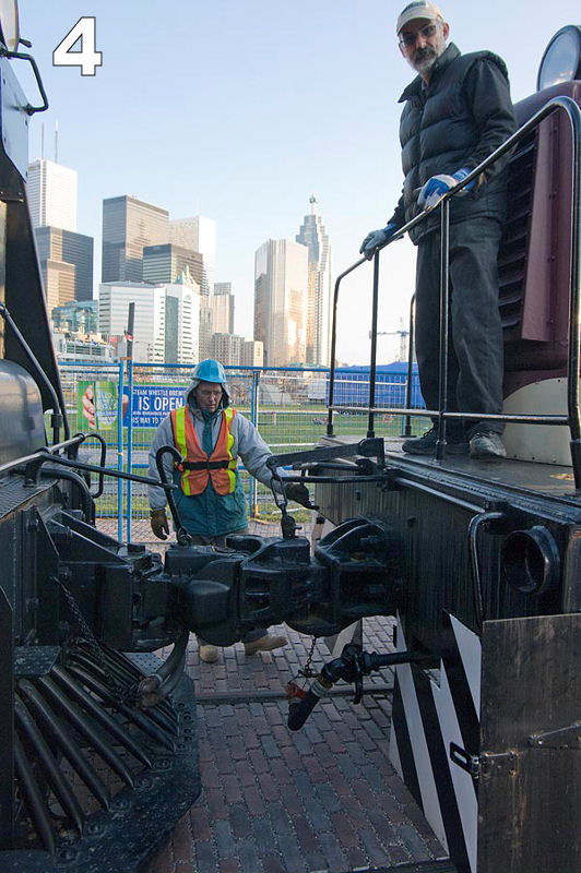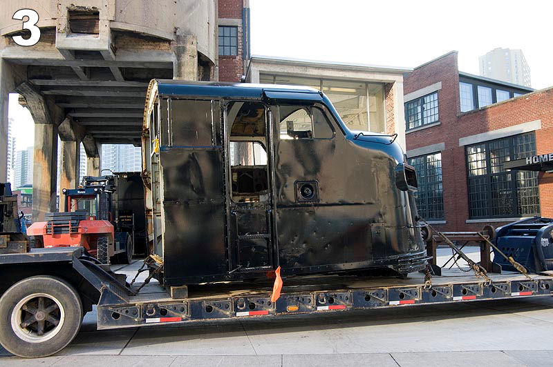 The F7 Cab has finally arrived at Roundhouse Park. In this sequence of pictures above we see the Cab arriving by float from Western Mechanical on Friday of last week. The Cab was delivered to the end of the track under the coaling tower. In the set of pictures below, our CLC Whitcomb switcher is being used to move the massive CNR Northern 4-8-4 on to the turntable and then on to to the coaling tower track to free track 34 for the delivery of the F7 on Friday. Track 34 is our loading and unloading track. The delivery process was not completed until midday so 6213 was returned to its fenced enclosure on track 34 overnight to await the move of F7 Cab to the roundhouse on Saturday.