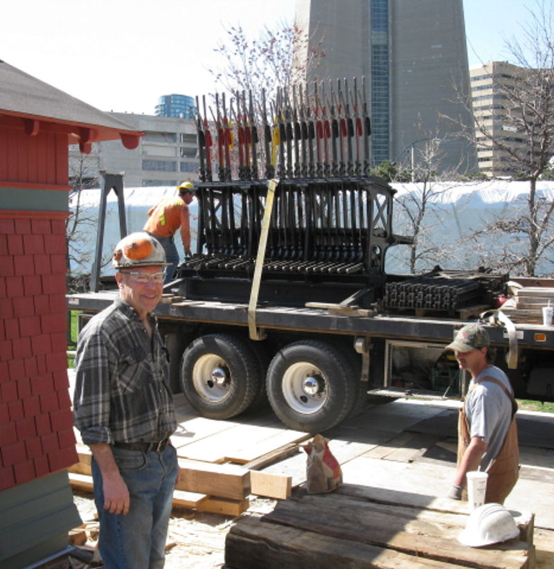 We are now pleased to report that today the restored lever frame was returned to Roundhouse Park, again using McCulloch Moving to transport it. In the images above, we find the McCulloch team appearing at Roundhouse Park followed by a view of the opening created in the west wall of Cabin D to accommodate the move of the lever frame into the building. In the last image, we find Mac McKim, the machinist responsible for the restoration work, standing proudly in front of the restored artefact.