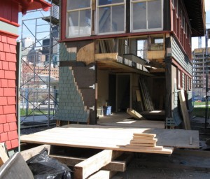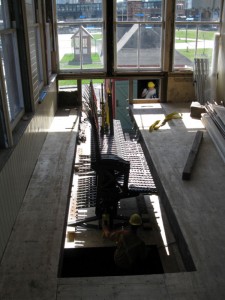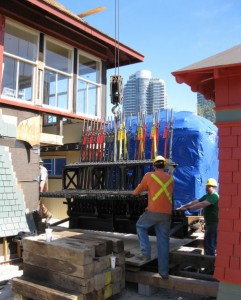 In the images below, we see the frame being lifted onto a temporary platform and then being moved into the Cabin. The final picture shows the frame resting at the bottom of the two storey high “pit” in which it has always been housed. Tomorrow the end wall will be reinstalled and on Friday the frame will be raised to its correct height and set up proeprly under the watchful eye of Mac McKim.