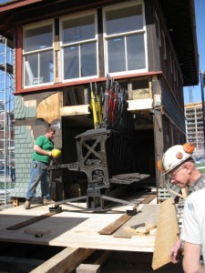 On June 26th, 2009, the massive frame of levers used in Cabin D to control the switches in the Toronto Rail lands were removed from Cabin D and sent away for restoration as captured in this TRHA News item. On Septemebr 23rd, 2009 we further reported on the progress of that restoration in this TRHA News posting.