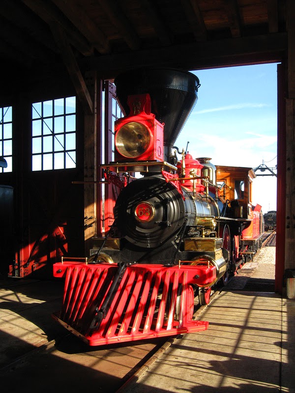 “Snuggling down for a long winter’s nap in the Age of Steam Roundhouse is 4-4-0 Leviathan, an operating replica of one of the first locomotives used on the Central Pacific line of the 1869 Transcontinental Railroad.  Custom built by David Kloke of Illinois, the Leviathan has its own highway tractor-trailer rig to haul it around the U.S.A., and has been exhibited and fired-up for legions of Americans. We will drop one of its driving axles to do some bearing work in the Age of STteam back shop, and, come spring, she’ll awaken to a fire in her belly and steam in her cylinders for some test runs across the Ohio countryside before it heads out on its 2014 tour schedule.  What a thrill it will be to see, hear and smell those wonderful sensations created by this red-and-gold leaf steam beauty.”