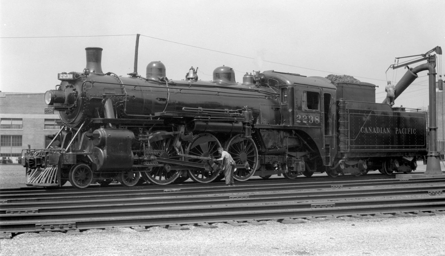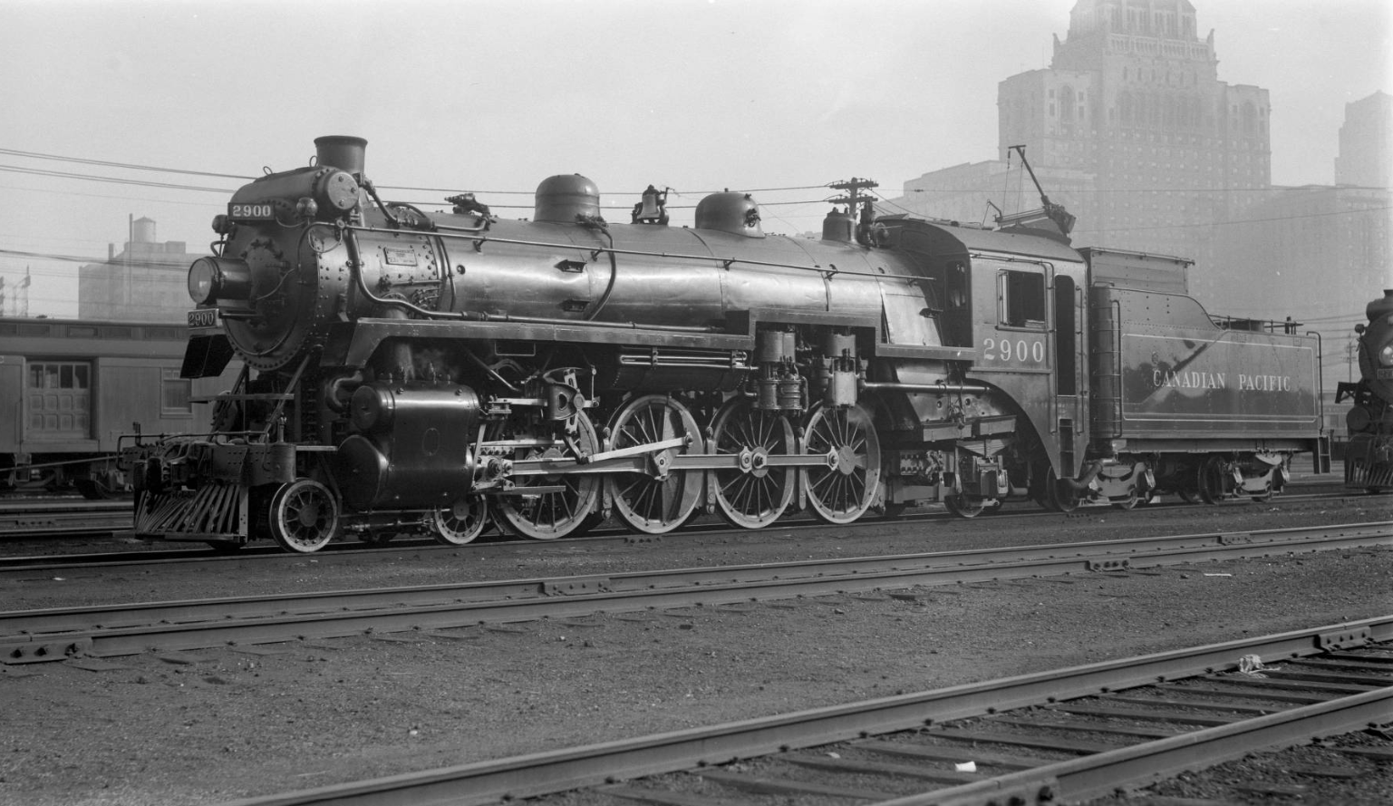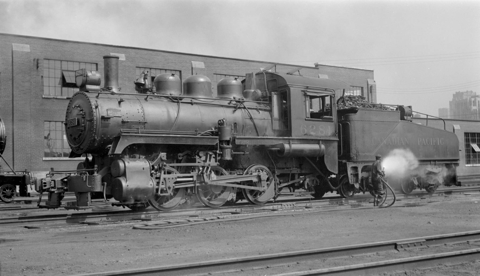 At the time of his visit, the John Street Roundhouse was brand new and had only been in operation for three years. Perry’s style was something that’s now known among railfans as the “roster shot”; typically a 3/4 wedge or side shot where a piece of railway equipment – usually a locomotive – takes up most or all of the frame. The locomotives were Perry’s primary interest here, and this gives us a glimpse at what a typical day looked like for workers at the John Street Roundhouse in its first few years of operation. These photos were taken at a time when diesel locomotives hadn’t yet appeared in Toronto, and even some of Canadian Pacific’s largest steam locomotives hadn’t been built yet. In the background of each image you can often see some recognizable landmarks – the coaling tower, the Royal York Hotel, and the roundhouse itself all make appearances.