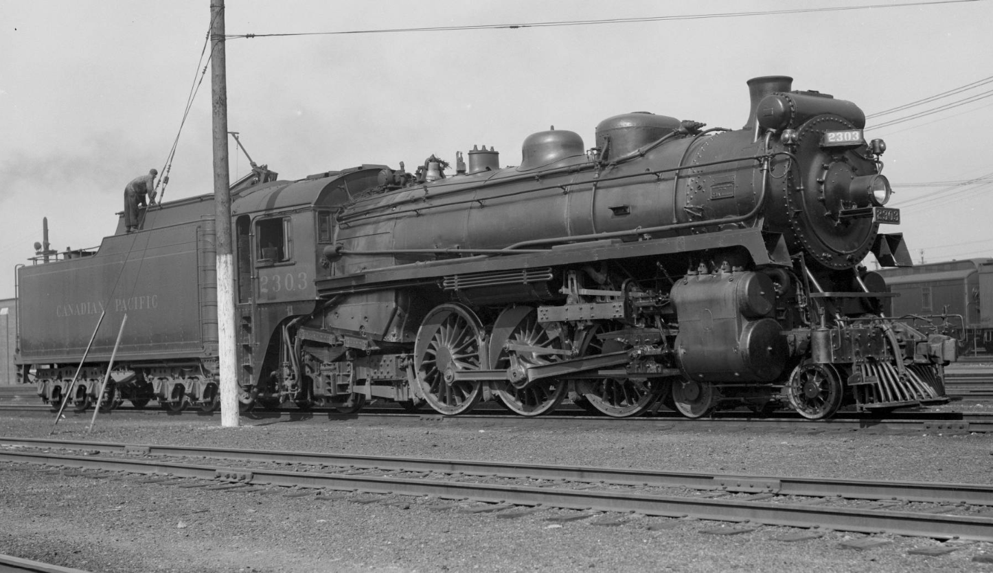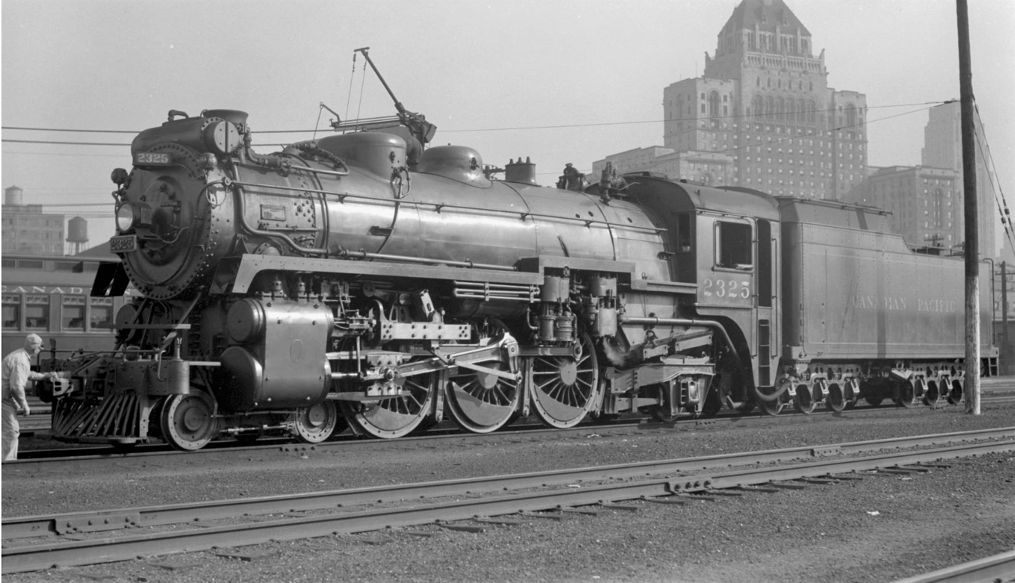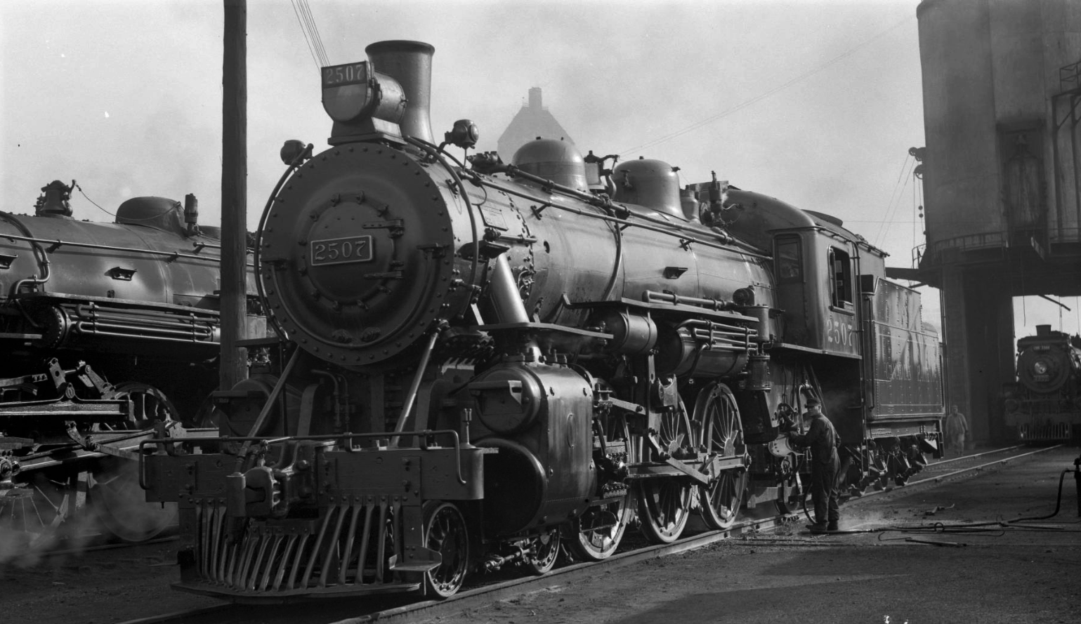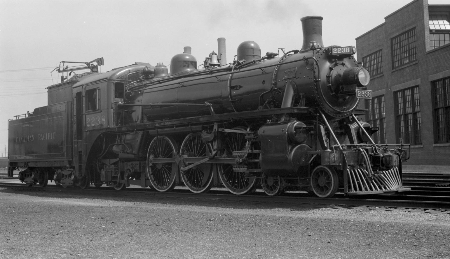 At the time of his visit, the John Street Roundhouse was brand new and had only been in operation for three years. Perry’s style was something that’s now known among railfans as the “roster shot”; typically a 3/4 wedge or side shot where a piece of railway equipment – usually a locomotive – takes up most or all of the frame. The locomotives were Perry’s primary interest here, and this gives us a glimpse at what a typical day looked like for workers at the John Street Roundhouse in its first few years of operation. These photos were taken at a time when diesel locomotives hadn’t yet appeared in Toronto, and even some of Canadian Pacific’s largest steam locomotives hadn’t been built yet. In the background of each image you can often see some recognizable landmarks – the coaling tower, the Royal York Hotel, and the roundhouse itself all make appearances.