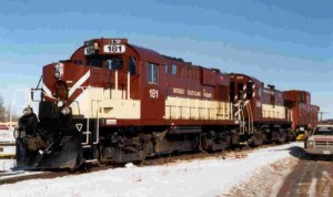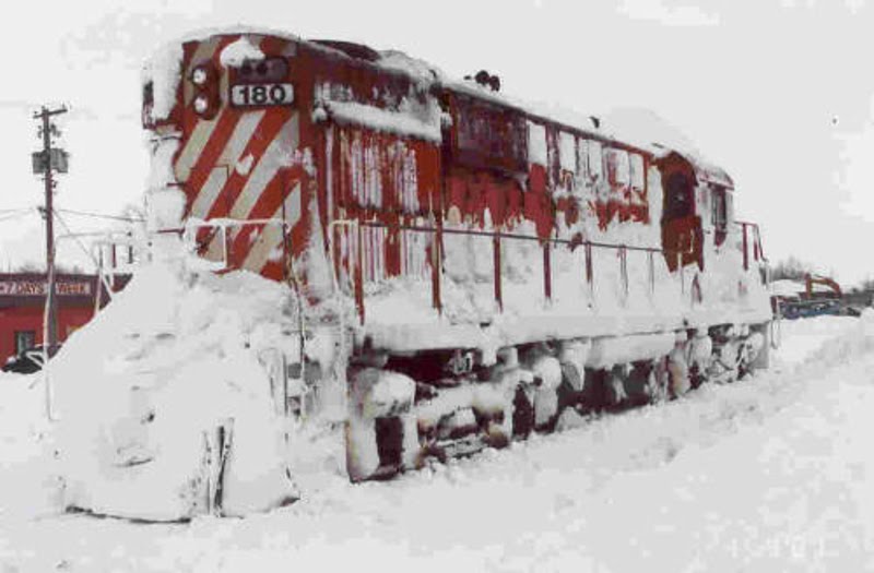 Railways have always been challenged with winter snowstorms. Today, you often find snow plow blades mounted on the front of today’s locomotives to allow a train to clear the tracks ahead of it when the amounts of snow on the rails are modest. In two of the pictures at the above left, we find Ontario Southland Railway (OSR) locomotives, #180 and #181, which are ex-CP RS18u engines, equipped with such snowplows.
