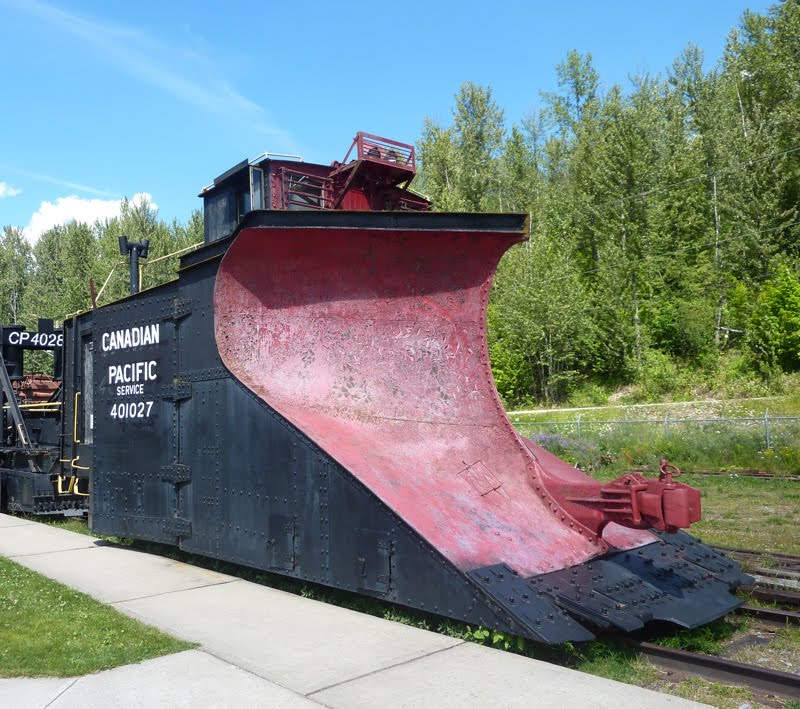If the snow on the tracks is deeper than a foot or two, railways will often bring in their classic wedge plows such as the plow in the picture at the above right which is part of the collection at the Revelstoke Railway Museum. In the video below by Walter Pfefferle, we find the OSR using their GP7 #378 and RS23a #503 and a plow borrowed from CP. They used this train yesterday on December 17th, 2010 to to plow the railway from Ingersoll to St Thomas.