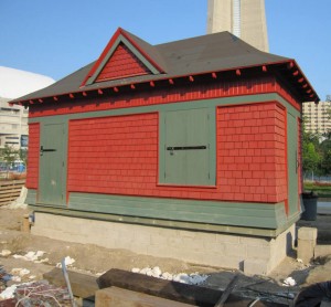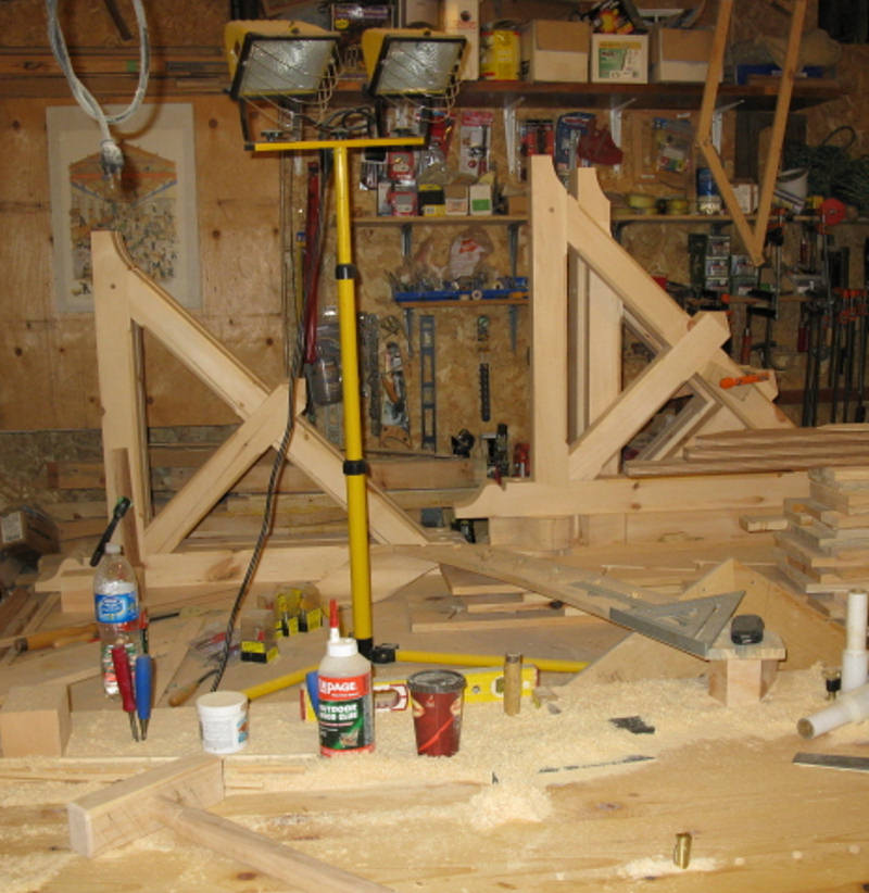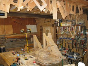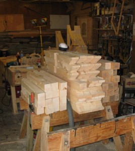 Work continues on restoration of Cabin D. Tom Murison, the restorer, advises that they have made all of the parts for brackets to support the soffit area of the structure. He notes in his reports to us that it s hard to get pine sheathing which is exactly 1″ thick these days so he had to buy some that were over 1″ thick and then reduce them to size using his planer in his shop. By doing this, the boards will match the original in thickness and character. The pictures above by Tom Murison show the brackets under construction.