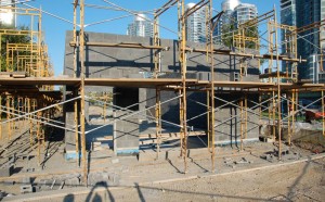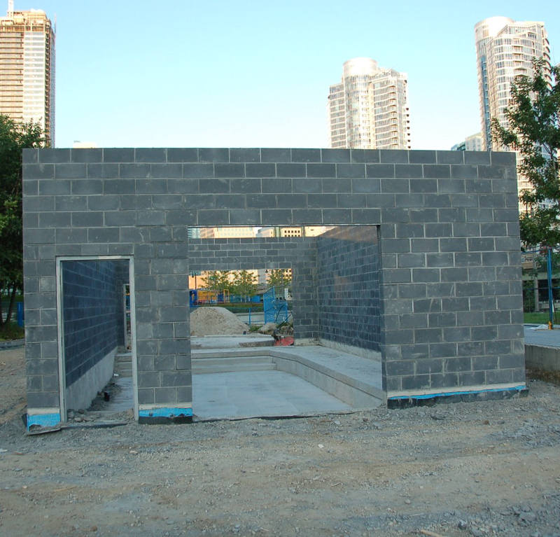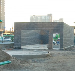 In the picture at the upper left, we see that the chimney on the tool shed has now been rebuilt while construction continues on Cabin D behind it. In the other two pictures above, the scaffolding used to allow the workmen to build the concrete walls of the train shed are shown. Below we see both ends of the train shed after the scaffolding has been removed.