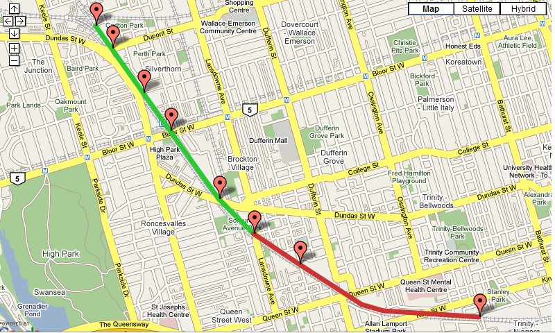 When completed, the proposed pathway will run diagonally from Cariboo Avenue (just North of Dupont) southwards across Bloor, Dundas, Landsdowne, Brock, Queen and King to a point close to Strachan Avenue near the western end of Wellington Street bicycle path network.