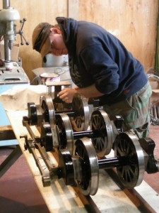 Jon made several visits to the roundhouse this week and spent his time applying gloss black enamel paint to the miniature locomotives driving wheels. This is a slow and tedious job due to the spoked design of the wheels. Jon and Michael then stripped the boiler and smoke box off the mainframes to make the frames ready for Jon to paint as well. In the picture above we see Jon applying paint to the wheels and chassis.