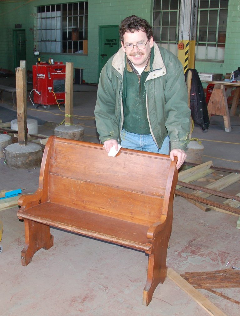 In the right hand picture above we find Richard M. and the restored bench. The bench had been stored in a delapidated state in the Roundhouse for many years. Here is his story about the bench: