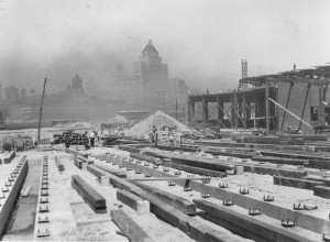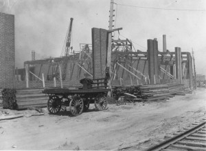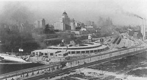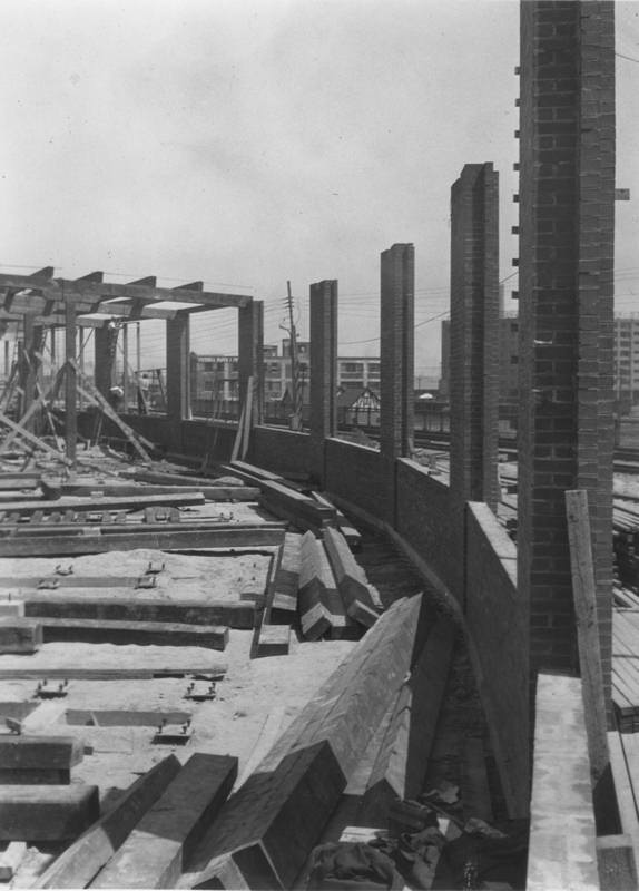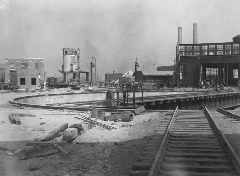 In the picture at the above left, we see the finished roundhouse against the Toronto skyline of that era. In the remaining pictures, we see the roundhouse under construction.