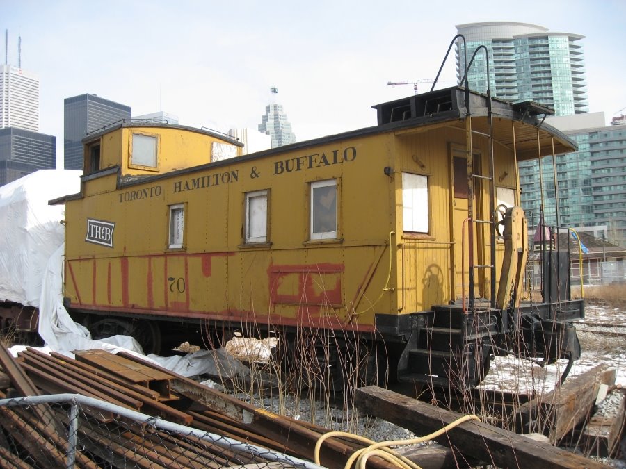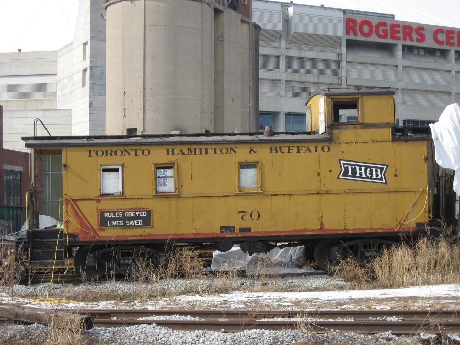 The museum’s collection of railway equipment includes Toronto, Hamilton & Buffalo Caboose #70. Currently it is being stored outside while renovations to the roundhouse are underway. The protective coverings have been temporarily removed allowing us to bring you these pictures of the unrestored caboose. The history of this caboose is captured in the Collections section of this website. It says …..