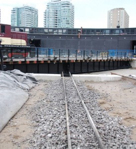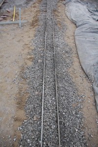 Now that the contractors have prepared some of the roadbed for the miniature railway, TRHA crews have now begun to install the railway track itself. After some planning and preparations on Thursday, the crew laid about 80 feet of track include the lead track from the turntable (as shown at the left above and in the middle picture). In the picture at right, we see that they have begun to install one of the crossings which allow the 7 1/4″ gauge track to cross 4′ 8 1/2″ mainline track. We know of no other miniature railway that crosses mainline track in the world so perhaps this is a first.