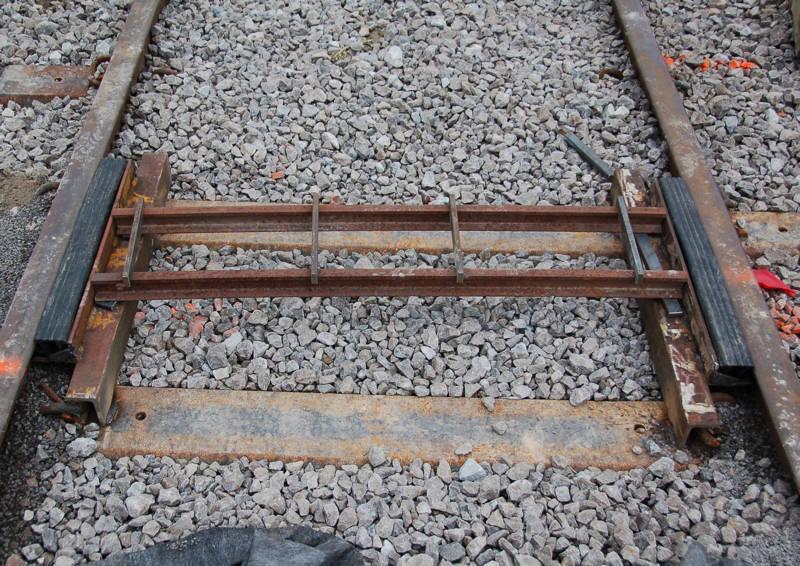 Now that the contractors have prepared some of the roadbed for the miniature railway, TRHA crews have now begun to install the railway track itself. After some planning and preparations on Thursday, the crew laid about 80 feet of track include the lead track from the turntable (as shown at the left above and in the middle picture). In the picture at right, we see that they have begun to install one of the crossings which allow the 7 1/4″ gauge track to cross 4′ 8 1/2″ mainline track. We know of no other miniature railway that crosses mainline track in the world so perhaps this is a first.