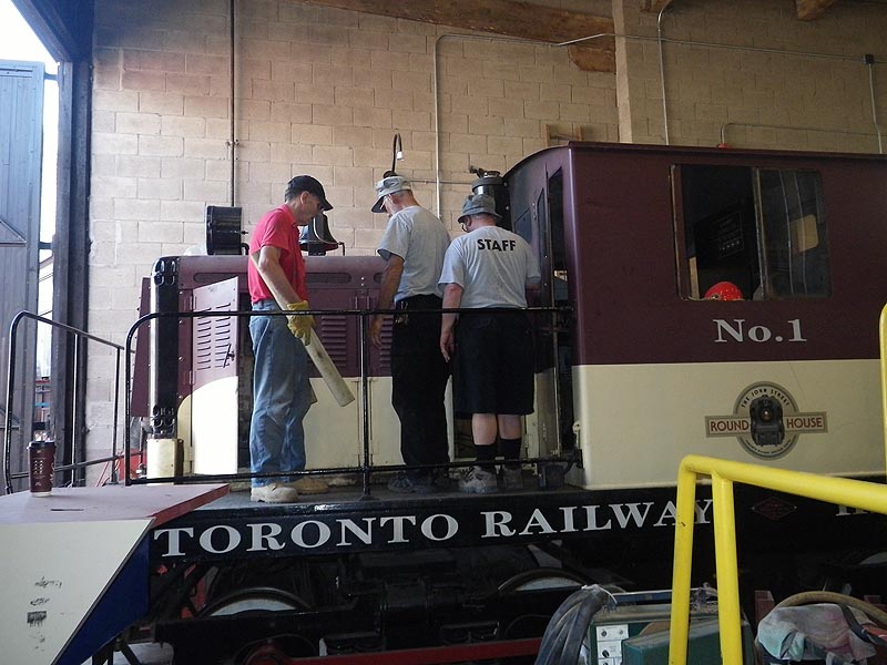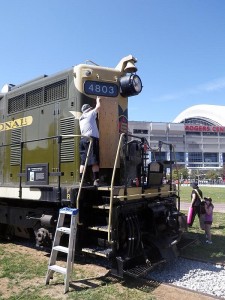 We also applied some temporary plywood anti-climb plates to keep people from climbing up onto the roof of #4803 (this was successful and the ply will be replaced by plexiglas). Thereafter, for the entire day, I don’t think there was ever a time when less than a dozen people (kids of all ages) were to be seen on the steps and catwalks of the locomotive taking photos and enjoying the novelty of a close encounter with a diesel locomotive.