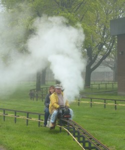 The “Trains, Boats and Meccano” weekend was quite a success at the Hamilton Museum of Science and Technology despite inclement weather throughout the last weekend. The rain held off for most of Saturday allowing all of us to display and operate our models outdoors. However on Sunday a cold snap plus a foggy misty rain drove the Meccano and boat displays indoors. The miniature railway operations ceased around lunchtime due to the cold, rain and lack of brave souls willing to ride..