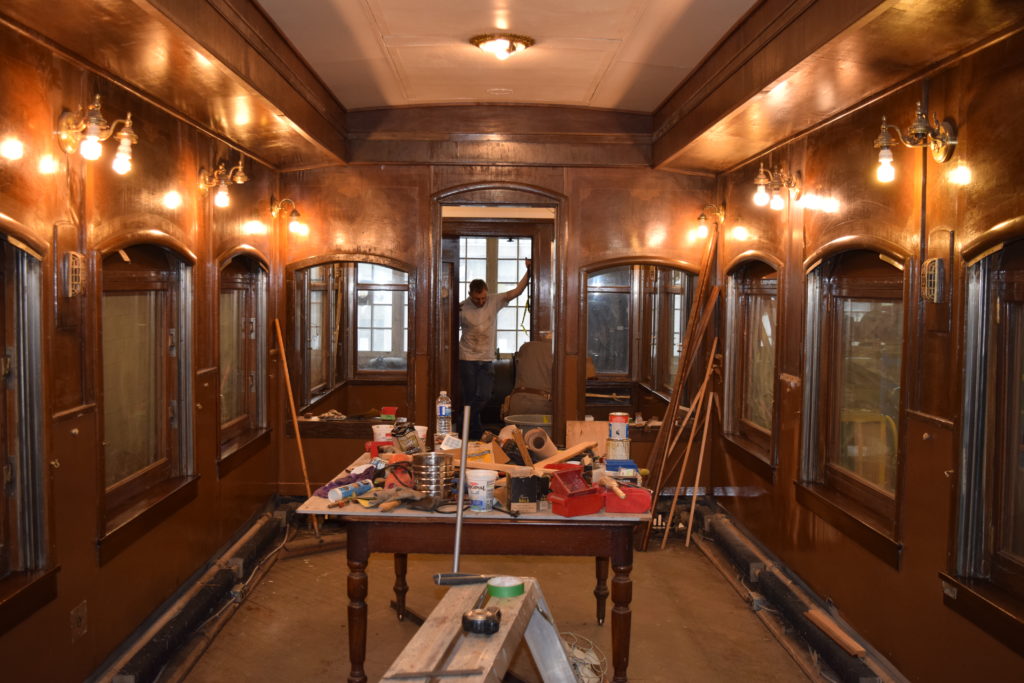 Cape Race was built for the Canadian Pacific Railway in 1929 as the River Liard. The car was one of a series of 15 River cars fabricated at National Steel Car in Hamilton for $66,300 apiece. The opulent interiors were finished at CP’s Angus Shops in Montreal and featured individual ladies’s and gentlemen’s showers, leather-upholstered smoking rooms, ladies’ lounge and observation parlour as well as a small buffet to serve snacks and beverages.