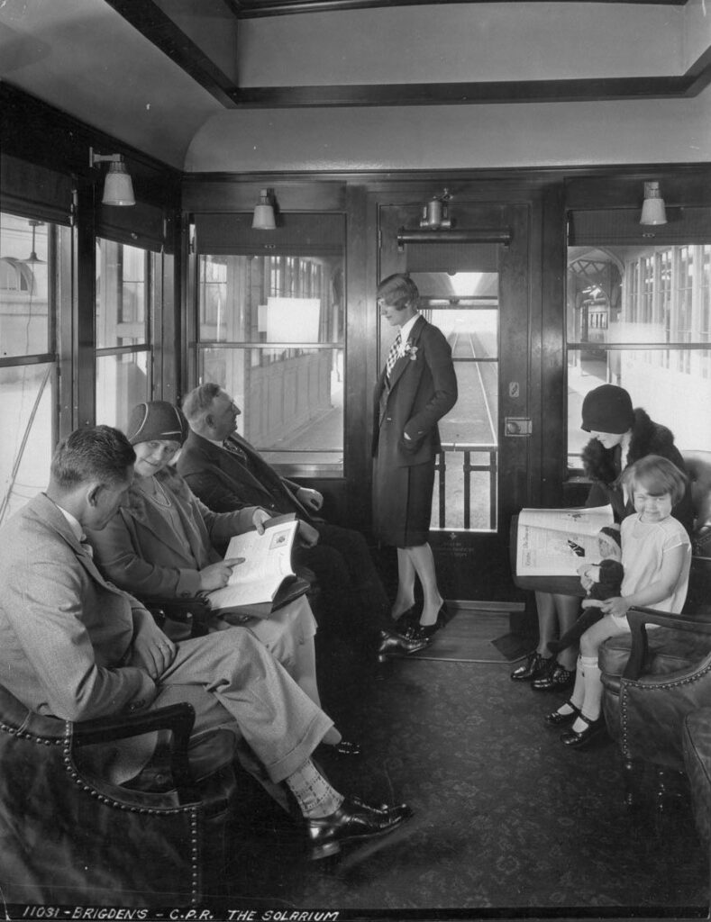 Instead of the traditional open observation platform on the rear, the cars featured a high-windowed solarium furnished with eight leather chairs. In an era long before exposure to the sun’s ultra-violet rays was considered harmful, CP promoted these solarium-lounge cars with their “health-giving VITA GLASS Sun Parlors.”