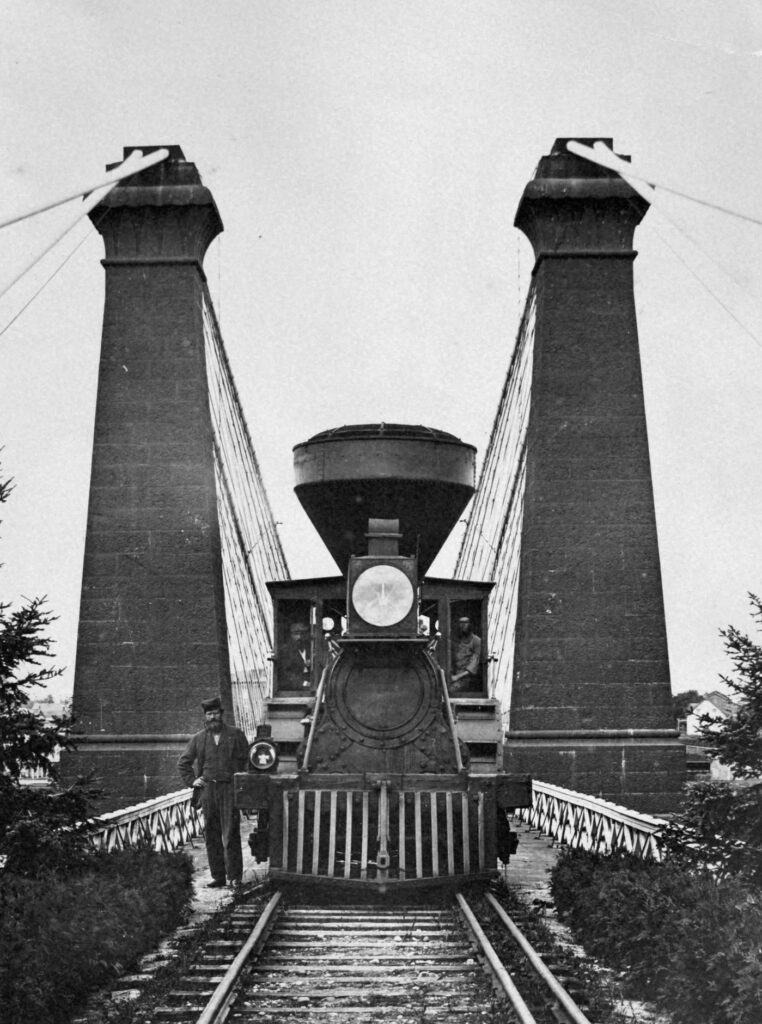 Roebling’s final design was a double-decker suspension bridge with train tracks on top and a road underneath for pedestrian and carriage traffic. While only wide enough for a single track, the bridge would be designed to carry three separate railway gauges simultaneously to correspond with each railway company on either side of the gorge. In addition to the 5-foot 6-inch gauge Great Western on the Canadian side, the American side had the narrower 4-foot 8.5-inch gauge New York Central Railroad and the wider 6-foot gauge Erie Railroad, both of whom were also interested in making use of the bridge. Concerns were raised by the public over the potential for collapse, to which Roebling responded by further strengthening the bridge with guywires. After testing the bridge with a 26-ton locomotive and 20 loaded cars, the suspension bridge was opened on March 18th, 1855. In addition to being the first railway bridge over the Niagara River, this was now the Great Western Railway’s first direct rail connection to the United States.